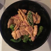 ごま油香るたけのこと豚バラ肉の炒め物です。豚バラ肉は、ブロックを使って炒めているので、ジューシーで香ばしい香りがし、ついつい箸が進みます。スナップえんどうも入って、見た目もきれいに仕上がっています。
