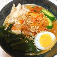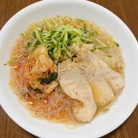しらたきを使ったヘルシーで満腹感のある一品です。スープは鶏がらスープと酢のさっぱりとした味わいで、お好みで砂糖を加えて調整できます。きゅうり、もやし、ワカメ、キムチなど具材は自由にアレンジ可能。仕上げにごま油や辣油を回せば、より本格的な味わいに。ダイエット中の方にもおすすめで、手軽に作れるのも魅力です。