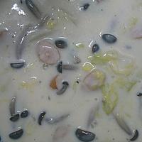 シメジを入れました。最後は、残ったクリーム煮に刻みニンニクを入れ、スープスパゲティにして食べました。