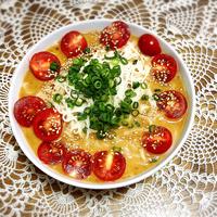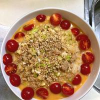 - 4 器に3、1の長ねぎ、2を入れます。1のミニトマト、小ねぎ、白いりごまをのせて完成です。
