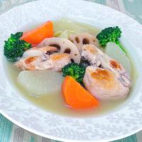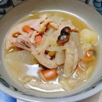 白菜をたっぷり入れて、鶏もも肉と一緒に和風仕立てのポトフにしてみました。野菜の素材を味わえるように、スープはあっさりと仕上げてます。お好みの肉や野菜を入れるとレパートリーが広がります。体が温まる一品ですので、是非お試しくださいね。