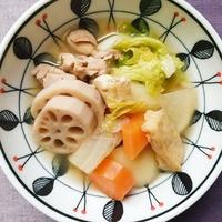 骨付きぶつ切り鶏肉に塩をして暫く置いて水分を拭いてから焦げ目を付けるように焼き、水と昆布だしパックと料理酒を入れて15分煮込み、その途中でレンコンを入れる。白菜以外の野菜と玉ねぎ麹を入れて水を足して約20分、白菜入れて10分煮込む。粗熱が取れたら茹で置きのブロッコリーを入れ、冷まして味を含ませる。