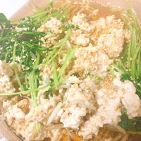 材料全二倍、ミンチの代わりにツナ缶小2、湯どうししたモヤシをザル入れた豆苗にかけたので、新たに水分入れず。白ゴマ追加。