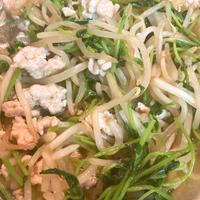 - 1 もやしはさっと水で洗い、豆苗、豚ひき肉と鶏ガラスープ、しょうゆ、塩こしょう