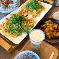 とりももを使用。セロリがなかったので、しめじとなすと厚揚げを追加。麺は片面よく焼き。