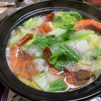 - 5 鶏もも肉の色が変わったらエビ、1、2、しめじを入れて中火で加熱します。白菜がしんなりしたらうどんを入れてパッケージの表記通りに煮ます。