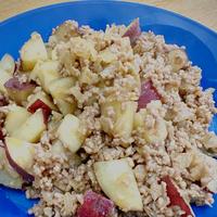 お味は美味でした。お手本のサツマイモは1センチより大きいのかな?サツマイモ大好きなので主役らしくもう少し大きくカットしたら主菜らしくなったかなと。お箸では食べにくいのでスプーンを添えました。取り分けて翌日のお弁当にも利用。ご飯に乗せて芋入りそぼろ弁当♡