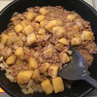 - 6 玉ねぎ、豚ひき肉を入れ中火で色が変わるまで炒め、調味料の材料を入れ炒めます。