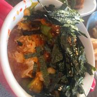 食べかけ横向き汚くてごめんだけど、冬なのでカップに、絹豆腐なかったから木綿豆腐を入れて500ワットレンジで2分チン湯切りして、アボカドもキムチも2倍にしました!韓国海苔はなかったので、普通の刻み海苔にしました。