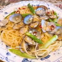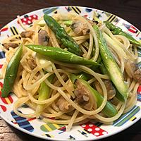 子供が食べやすいよう剥き身、白ワイン少量、鷹の爪ごく少量。あさりとアスパラの味が味わえるパスタでした。