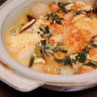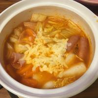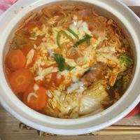 - 5 土鍋に3を入れ、キムチと1と2を並べ、4をかけます。ピザ用チーズを乗せ、蓋をして中火で加熱します。