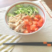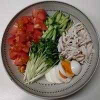 - 3 きゅうりを千切りにし、ゆで卵を輪切りにし、トマトをザク切りにします。