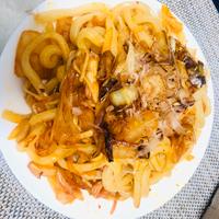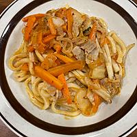 - 5 色がまとまったら、かつおだしの素を入れ、水でほぐしたうどんを入れ軽く炒めます