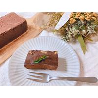 - 6 粗熱を取り、冷蔵庫で2時間程冷やし、型から外してお好みの大きさに切り分けます。お皿に盛り付け、ココアパウダーをふりかけ、完成です。