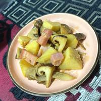 - 5 1、3を入れブロックベーコンに焼き色が付くまで中火で3分程炒めます。
