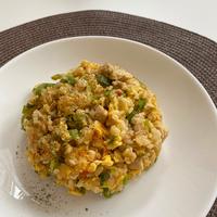 - 4 卵が半熟状になったらごはんを加え、中火のまま炒めます。