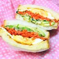 豆苗1分レンチン!ツナとハムで♡にんじんは入れずに ゆでたまごをマヨネーズで和えてはさみました(^-^)アレンジしすぎちゃいましたが美味しかったです)^o^(