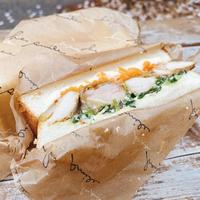 豆苗と鶏ささみをマスタードマヨネーズで和え、たっぷり挟んだサンドイッチです。アボカドやにんじんも一緒に挟んで、彩りもきれいなボリュームたっぷりのひと品です。生の豆苗はマヨネーズととても合いますので、是非お試しください。