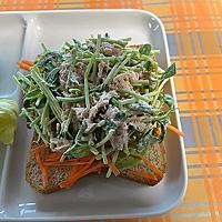 余った豆苗を使い、ささみをツナ缶に変え、トーストした胚芽パンに具材を乗せました。ボリュームもあって味も美味しかったです。