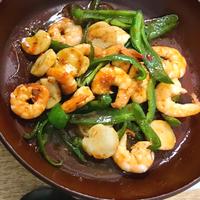 エビとホタテのXO醤炒めのご紹介です。プリプリのエビとホタテがシャキシャキのピーマンとよく合い、XO醤の旨味が染みてとても美味しい一品です。紹興酒を入れると香りが良く、アクセントになっています。ぜひお試しください。