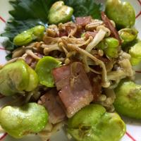 そら豆とひらたけのニンニクバター醤油炒めは、いかがですか。ほっくりとした食感のそら豆と、歯ごたえのあるひらたけに、ニンニクバター醤油の味付けがよく合い、とってもおいしいですよ。簡単なので、ぜひお試しください。