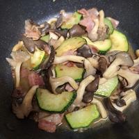 - 6 ベーコンに焼き色がついたら中火のまま、1、4を炒めます。