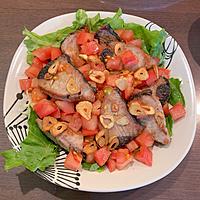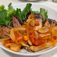 秋の旬の食材,戻りがつおを使ったガッツリ&さっぱりテイストのひと品です。トマトの酸味と、ニンニクの風味がよく効いたボリューム満点、大満足の一品です。ご飯との相性も抜群ですが、おつまみとしても、パンと食べても、とても美味しく召し上がれますよ。