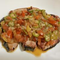 刺身で食べれなかったカツオで作りました。家庭菜園でできたトマトとオクラを使ってみました。
