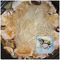 - 8 白菜がしんなりとしてきたら4を入れて中火のまま煮込み、豚バラ肉に火が通ったら春雨を入れて、パッケージの表記通りに加熱し、残りのごま油を回し入れて、火から下ろします。