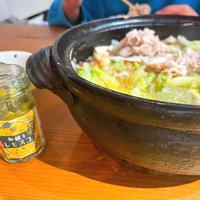 並べて行きます。水で戻した干し椎茸、鶏肉を加え、干し椎茸の戻し汁と水をヒタヒタまで加えてごま油を1回し,とにかくグツグツ煮ます。白菜がクタクタになったら塩で味を整えて完成!取り皿にスープと一味(柚子カラリン)を少々。具材を取り皿に取りいただきます。