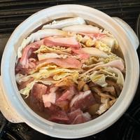 土鍋の鍋縁から白菜と薄切り豚バラ肉を交互に