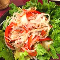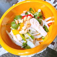 辛味を控えたあっさり味のタイ風サラダです。鶏むね肉をちくわやカニカマなどに変えても美味しいですし、レンジを使わないのでより簡単です。パクチーが苦手な方にもオススメのタイ料理の一品ですよ。是非お試しくださいね。
