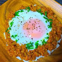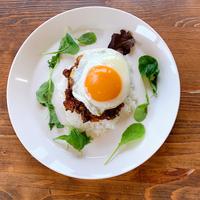 - 4 ごはんと3を器に盛り付け、中央に温泉卵をのせ、パセリをかけて完成です。