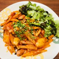 - 3 中火に熱したフライパンにごま油をひき、1を3分程焼き色が付くまで炒めたら、塩こしょう、2、しめじ、キムチも加えて全体に火が通るまで炒め、ケチャップ、ラー油を入れ、絡めます。