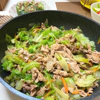 - 4 豚バラ肉に火が通ったら1を入れて中火で炒め、全体に油が回ったら塩こしょう、しょうゆで味を調え、全体に味がなじんだら火から下ろします。