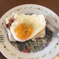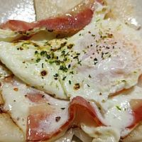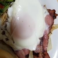 ベーコンともんじゃの名残のお餅を消費したくて\(^^)/まぁ、普通のベーコンエッグのが好きだけど、お餅がモチモチ食べ応えある。