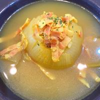 レンジで作る、丸ごと玉ねぎのカレースープのご紹介です。とろっととろける玉ねぎと、玉ねぎやベーコンのうま味が溶け込んだスープは、ほっこりとしたおいしさです。朝ごはんやブランチにもぴったりですよ。ぜひ、お試しくださいね。