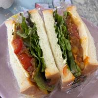 - 4 食パン2枚にマヨネーズをかけ2のサニーレタスを敷き、3、2のミニトマト、スライスチーズの順にのせたら残った食パンをそれぞれにのせます。