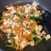 - 2 フライパンにごま油を強火で熱し、豆腐を手でほぐしながら炒めます。ある程度水分が飛んだら切った野菜、調味料を入れて野菜がしんなりするまで炒めたら完成です。