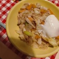 - 3 キャベツがしんなりしたら、うどんとたらこを加えて中火で炒めます。