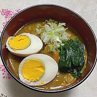 三人分の分量で作成。豚こま肉、ゆで卵、人参、玉ねぎ、ほうれん草、葱を入れ、野菜たっぷりにしました。本当にクリーミーで美味しいので、お勧めです。