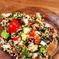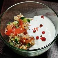キヌアを沢山使ったバルサミコ酢ベースのサラダのレシピのご紹介です。キヌアと角切りにした野菜を混ぜているので、スプーンで食べやすくなっています。バルサミコ酢のドレッシングでさっぱり召し上がれますので、是非お試しください。