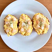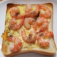 - 3 食パンの全体に2を広げ、エビを乗せ上から粉チーズをかけます。