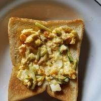 タルタルソースに長ねぎを混ぜてエビと一緒にトーストにしました。長ねぎ好きにはたまらない一品です。プリプリのえびに長ねぎ風味のタルタルソースが絶妙に合わさりとても美味しいです。お好みでチーズを乗せたり、アレンジしてみてくださいね。