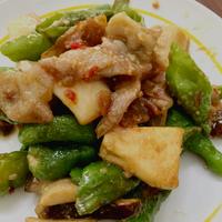 万願寺とうがらしとナス、豚バラ肉を豆板醤の効いた甘辛い味に仕上げた一品です。しっかりとした味の炒め物ですので、ごはんとの相性が最高でお箸がすすみますよ。お酒のおつまみにもオススメです。ぜひ、お試しください。