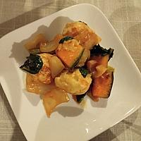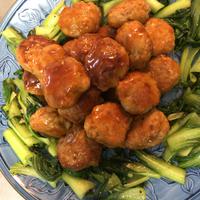 肉団子と一緒にかぼちゃ、玉ねぎ、小松菜も炒めて野菜たっぷりにしたらおいしかったです😋