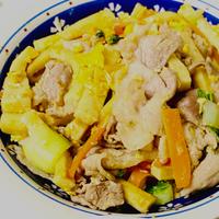 - 4 フライパンにごま油と生姜、ニンニクを入れて中火で熱し、香りが出てきたら豚バラ肉を入れ、火が通ってきたらチンゲン菜と2を入れて炒めます。