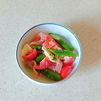 - 1 アスパラガスは3cm幅に切ります。耐熱ボウルに入れて塩をふり、濡らしたキッチンペーパーを乗せ、ラップをして600Wの電子レンジで1分柔らかくなるまで加熱し、粗熱を取ります。