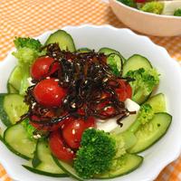豆腐の周りにきゅうりとブロッコリーを添えました。トマトと塩昆布とごま油のドレッシングが豆腐と野菜に絡まって、最後まで飽きずに食べられます。