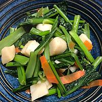 - 3 ホタテ貝柱の色が変わったら1を入れ中火で炒め、小松菜がしんなりしたら(A)を入れ炒め合わせます。